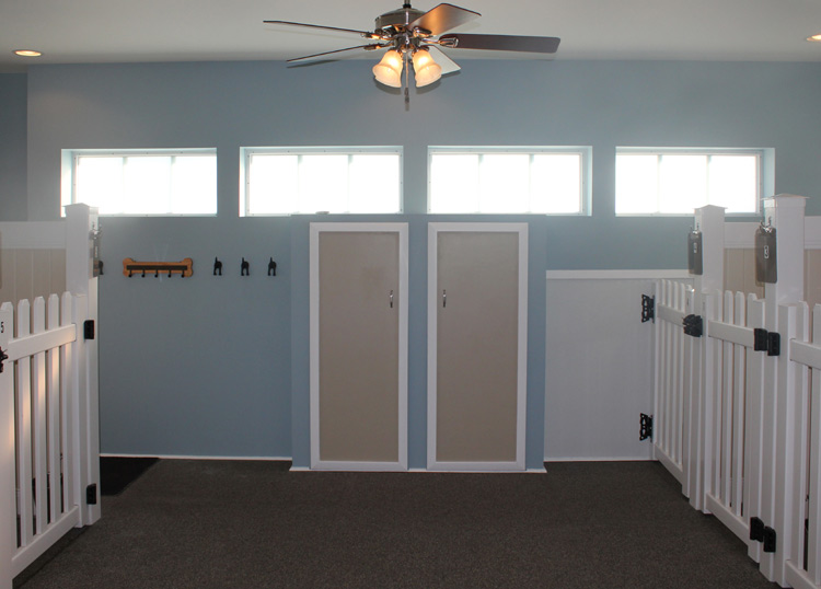 The entire room is insulated, with a rubber floor for comfort and traction (much easier on the dog's joints vs. concrete), and is heated or air conditioned as needed to keep the dogs comfortable year-round.